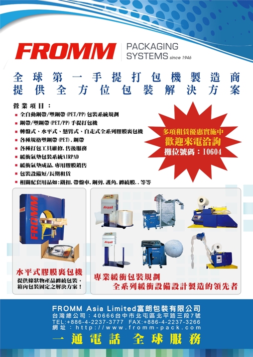瑞士【FROMM 富朗包裝】這次在展會當中,將展出最新打包機系列,提供最佳包裝解決方案,歡迎各界貴賓蒞臨指教。