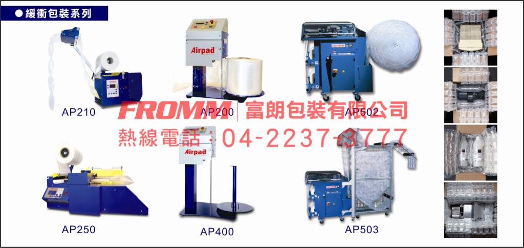 【FROMM富朗包裝】在市場上始終保持大型氣墊製造機的領先地位,讓【FROMM富朗包裝】集團成為市場上佔有率最多的大型氣墊製造設備,【FROMM富朗包裝】了解小量緩衝和填充的客戶需求,並積極開發一系列小型緩衝氣墊製造機AP210和AP250,已於2012年1月同步上市,提供一系列CE認證的小型>中型>大型>全自動緩衝氣墊設備系列已到位: